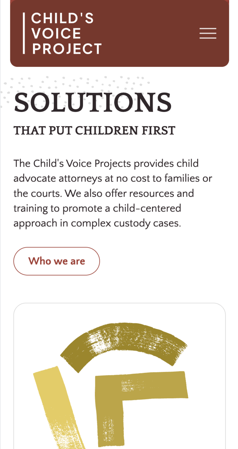 Many websites with services like Child’s Voice Project have stock photography. It was important for the team to stand out from the crowd and emphasize the rights of children in custody hearings. Our design team incorporated hand-drawn elements to bring a childlike feel to the site without making it look juvenile. Additionally, watercolor images added emotional depth and a personal touch without relying on stock photography.