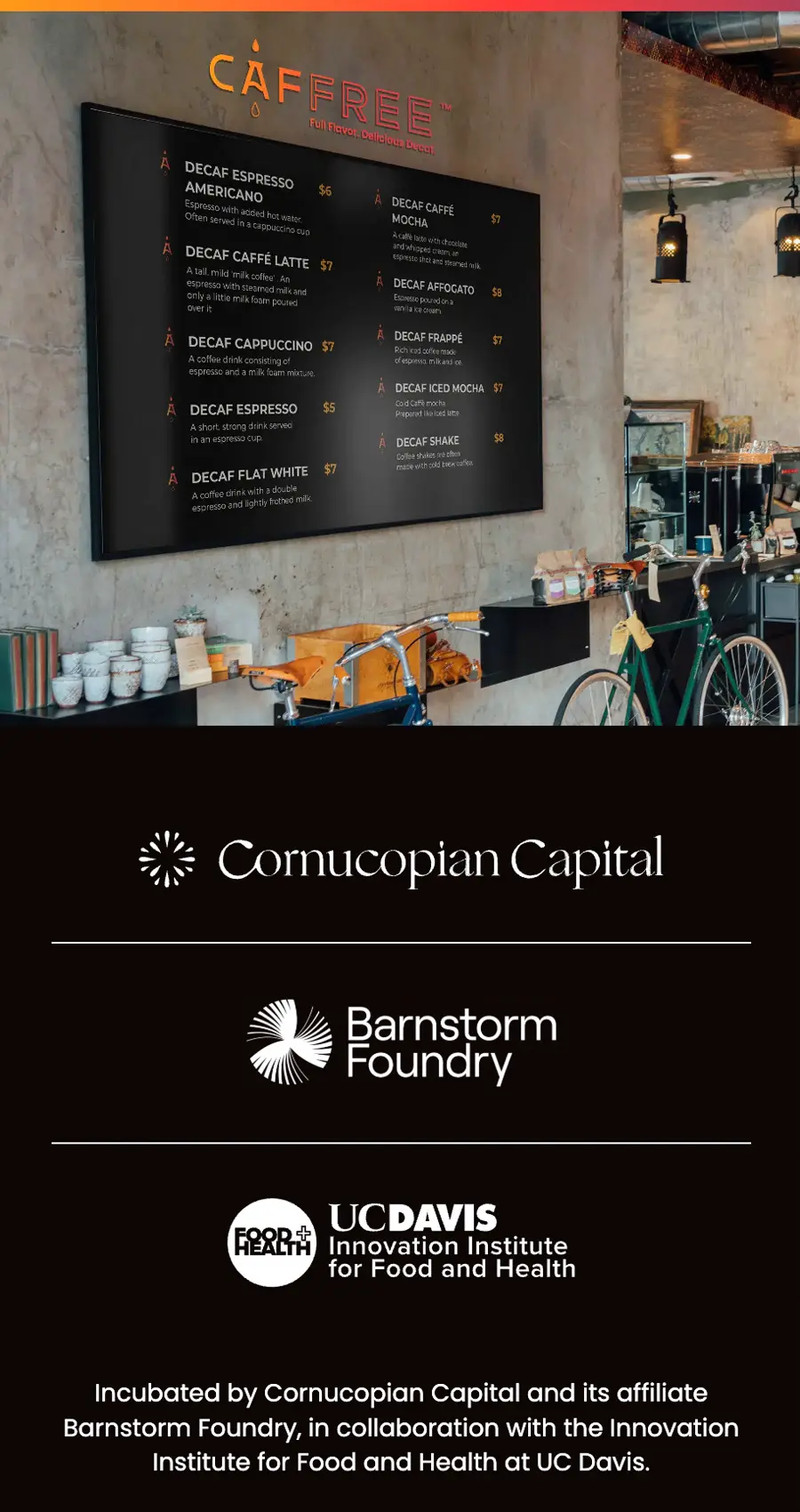 - A brag bar to show proof of quality. This one showcases the companies Caffree is a part of, including Cornucopian Capital, Barnstorm Foundry, and The UC Davis Innovation Institute for Food and Health.