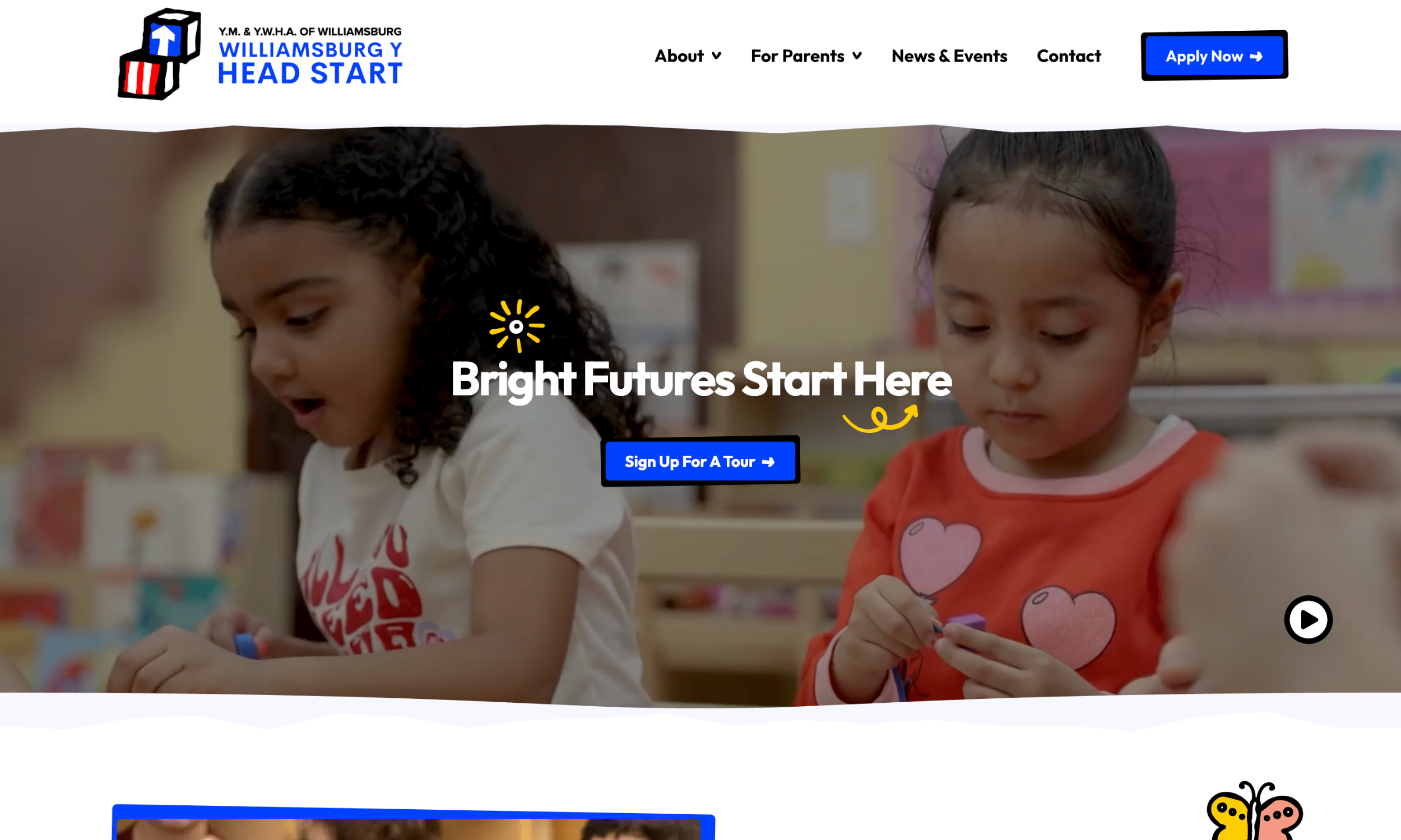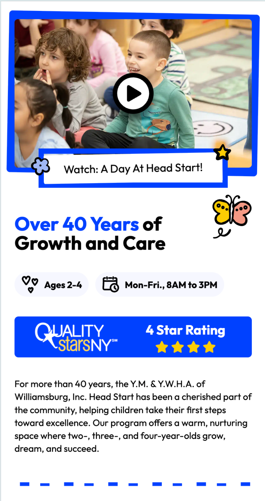 Parents want to see a preview of the learning experience their child could have at school. To give them a taste of a day-in-the-life of a child at Williamsburg Y Head Start, the hero video plays a ten-second loop of children playing. Additionally, parents can easily access the 11-minute virtual tour straight from the homepage. Both of these encourage parents to take the next step and sign up for an in-person tour.