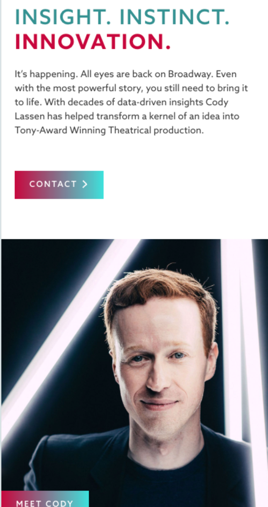 When one of Broadway’s biggest producers reaches out for website design work—you answer that call! Cody Lassen of Cody Lassen & Associates is an award-winning theater producer and live entertainment consultant. He connects investors to shows that share their passions. The proof is in the pudding: their productions have grossed over $770M and have a recoupment rate of 46.7%–more than twice the industry average!