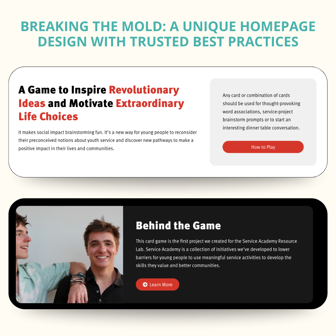 Our designer brought inspiration from his personal experiences to design the interactive hero image. The hero image mimics this gameplay, matching how the game will look when you have all the cards in your hand, giving website visitors a sneak peek of what to expect. When a visitor hovers over one of the five cards, it pops out so it can be read easily.