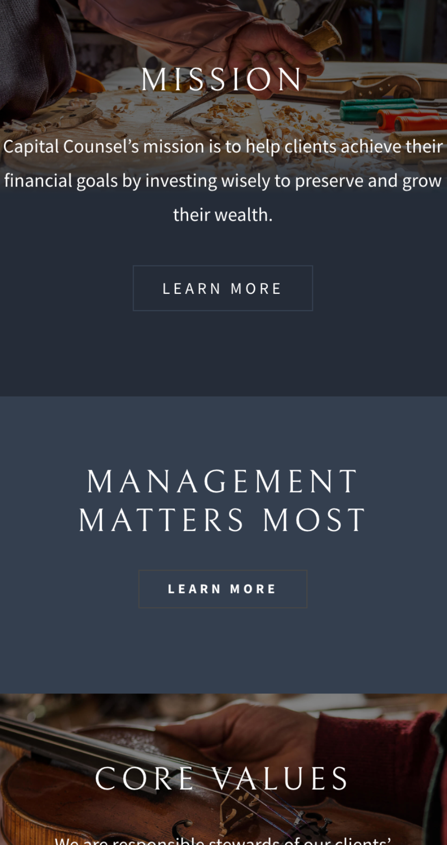 What our team came up with was a striking, modern design that combined elegant typefaces, a classic color palette, and beautiful, full-bleed images that reflected precision and artistry. Our web programmers, wanting to match Capital Counsel’s above-and-beyond style, developed a completely custom WordPress build with several unique interior pages, so that each page added to the company’s story with a new design and perspective. As the cherry on top, we added a simple but stately animated preloader to immediately define the brand with a logo and tagline, while giving the image-heavy home page time to load in a graceful manner.