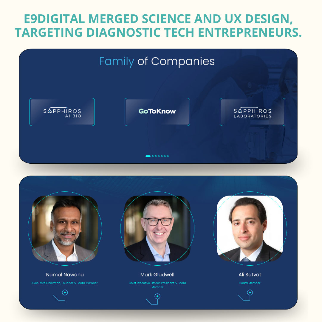 However, their current website didn’t accurately portray this story to their target audience. Sapphiros is always looking for entrepreneurs to partner with to evolve diagnostic technologies further. They needed a solid website foundation to encourage entrepreneurs to reach out and to act as the home base for outreach. Our designers at e9digital previously created the website for Neoenta, and Sapphiros is another B2B venture from Namal Nawana. He serves as the Executive Chairman, so he hired our team to work on the site for Sapphiros. He trusts our expertise in design for the B2B space, and we love working for him–it’s a win-win!
