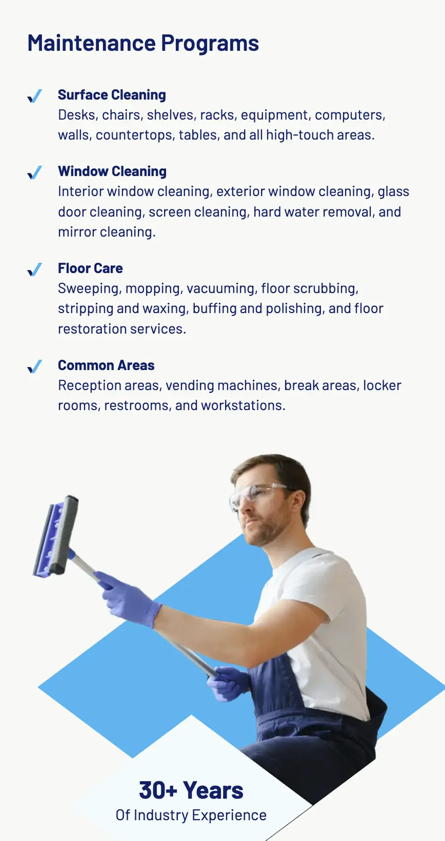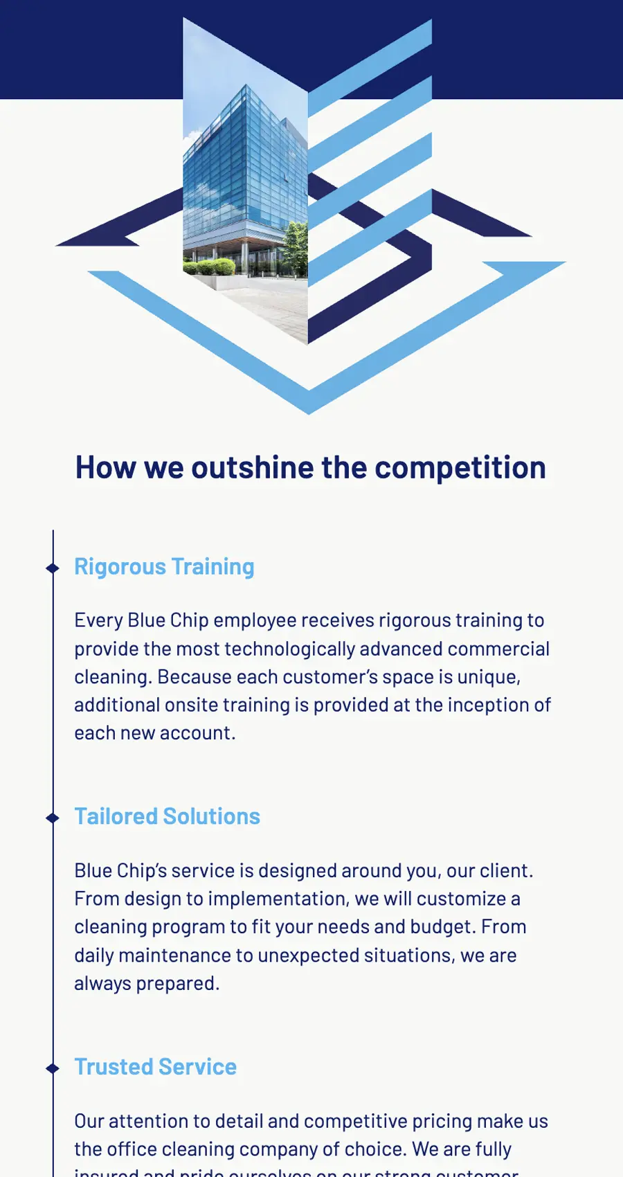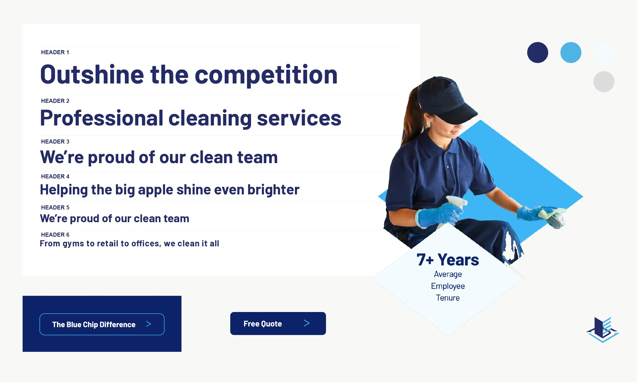 Blue Chip Building Maintenance has spent 30 years keeping the New York Metro area spotless. Their offline reputation was strong, but they needed a redesigned website that encouraged building owners, property managers, and superintendents to request a quote. With services ranging from commercial cleaning to window washing, the challenge was laying out their full offering in a way that spoke clearly to each segment of their audience.