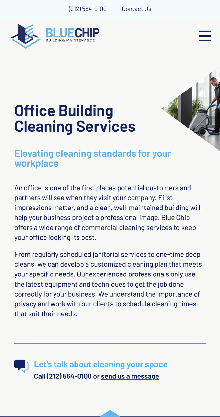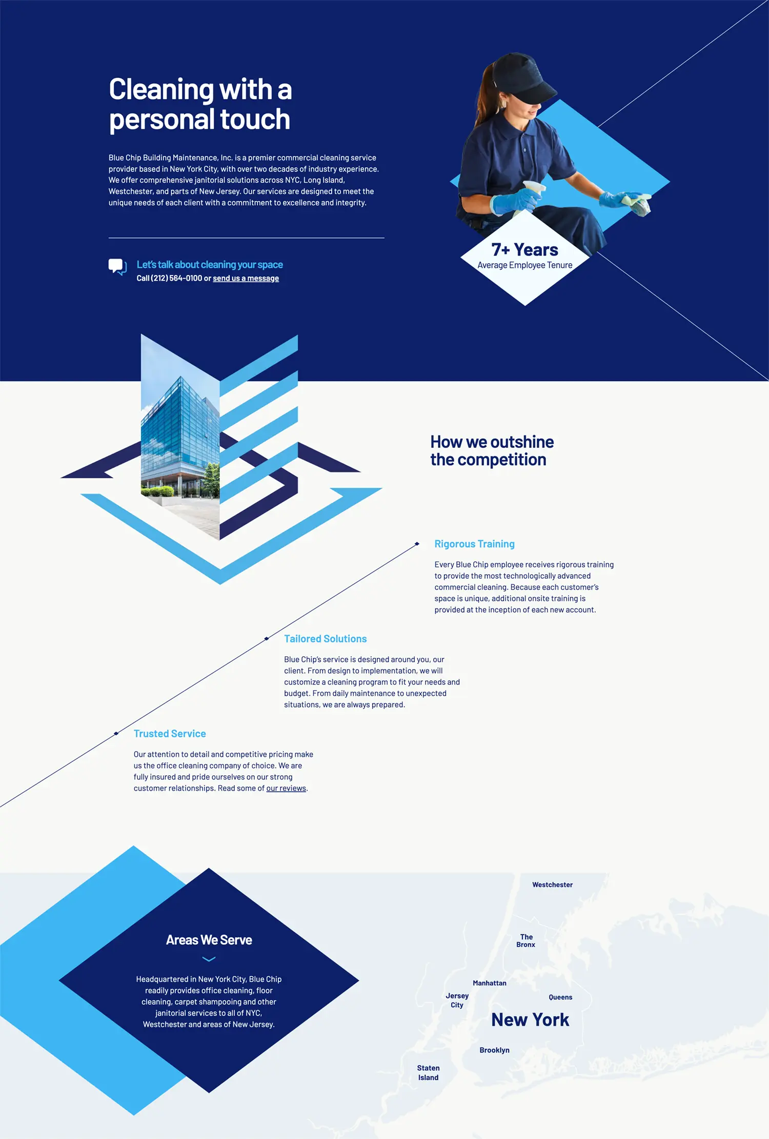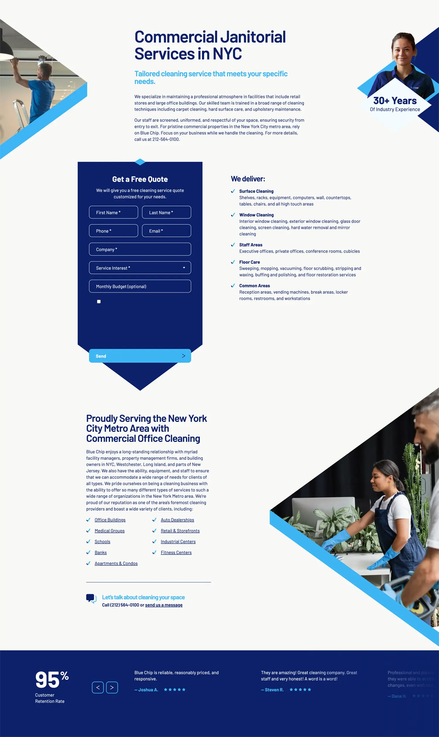 • Reviews, service highlights, client types, and employee spotlights to reassure the visitor and nudge them to contact Blue Chip.