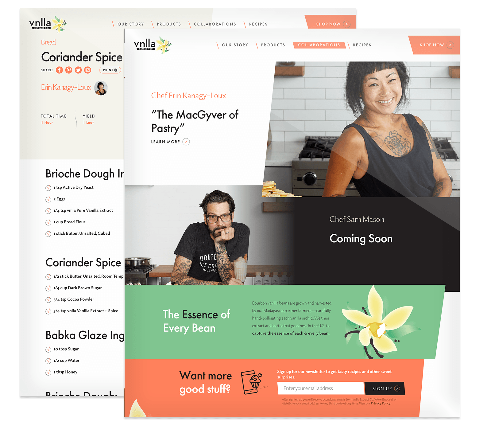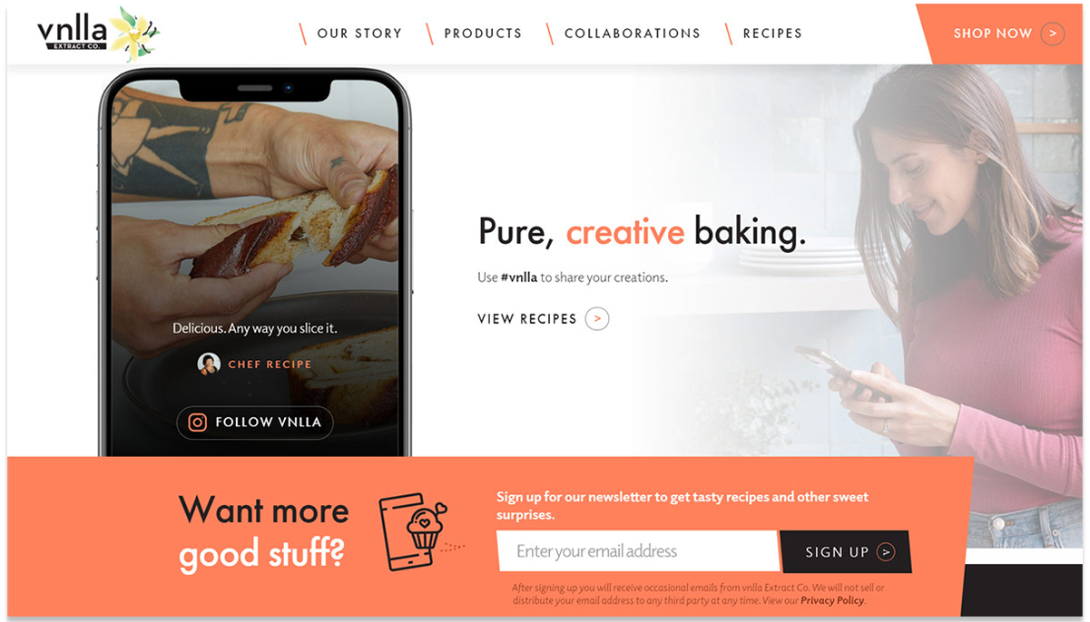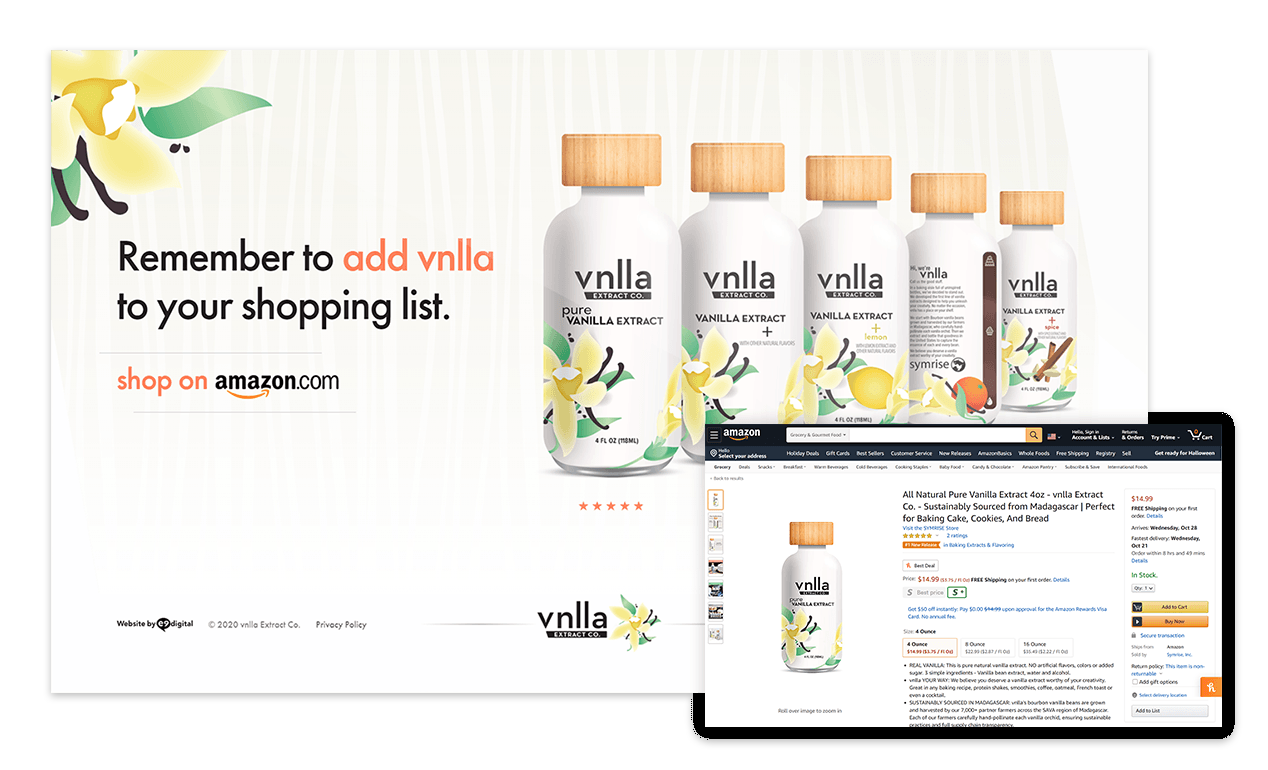 With a brand launch in today’s market you have essentially two options. Selling into brick and mortar grocery/specialty chains and ecommerce. Since physical locations would take more time and require more initial product, Symrise preferred to start with the latter—focusing on the top dog in the e-arena. Amazon. We kept ecommerce top-of-mind when developing the site map that incorporated shop buttons into the design/functionality, strategically placed in sections and with products. So let’s say mom wants to add an orange flavor accent to her chocolate Babka recipe. She just clicks the Amazon Shop Now button right next to the corresponding vnlla product and she’s right on Amazon—ready to add it to her cart. Easy.
