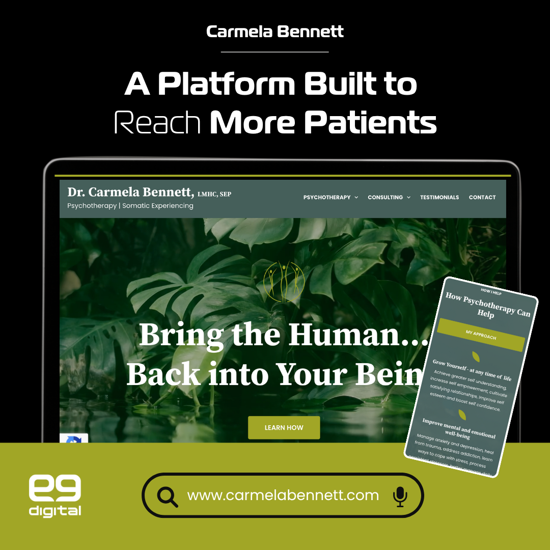 Dr. Bennett needed an updated website to launch her practice and appeal to her target audience, which includes adult individuals, families, couples, and professional women. She turned to e9digital due to our experience crafting modern websites for healthcare, including Dr. Judith and Satio.
