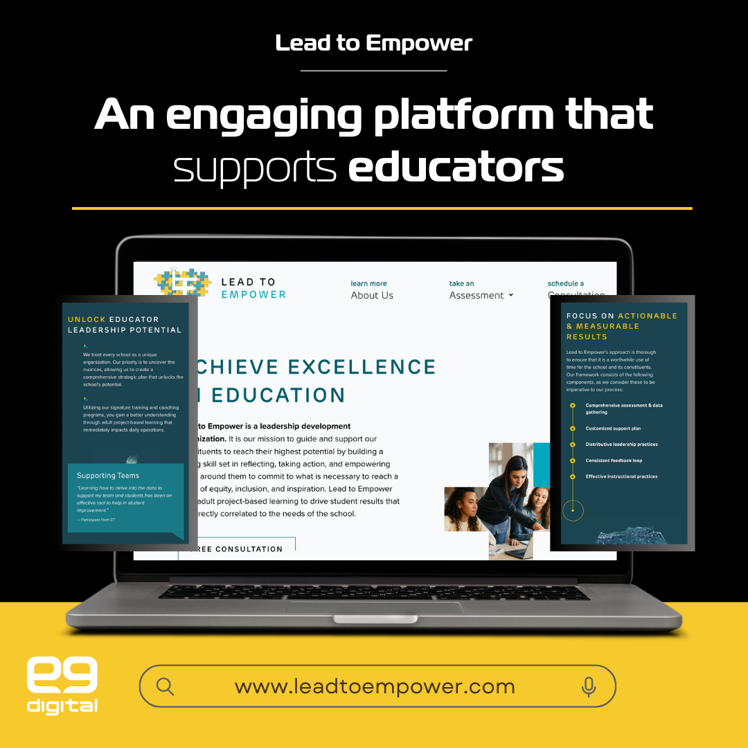 Our team at e9digital crafted a visually compelling, easy-to-navigate, and purpose-built website for educators. By incorporating a clean layout, strategic content structure, and visuals that resonate with Lead to Empower’s mission, e9digital launched an online platform that clearly communicates the organization’s impactful services to teachers and educational leaders. The redesigned site reflects Lead to Empower’s goals of fostering growth and transformation within academic communities.