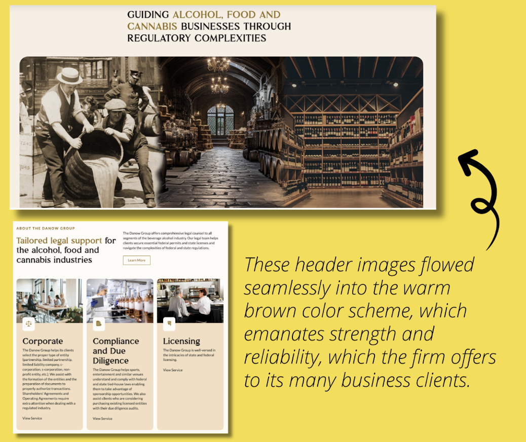 Alcohol has a storied past in American history, with the Prohibition Era offering a fascinating exploration of the importance of the beverage in culture. That’s why e9digital created a header image honoring that period, with three blended photographs guiding the visitor from the past to the present. This demonstrates Danow’s understanding of the past, but that they don’t live within the constraints of old ways of thinking. They use their vast experience to think outside of the box to get a yes for their clients. These images flowed seamlessly into the warm brown color scheme, which emanates strength and reliability, which the firm offers to its many business clients.